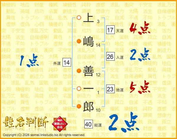 上(3画)嶋(14画) 善(12画)一(1画)郎(10画)