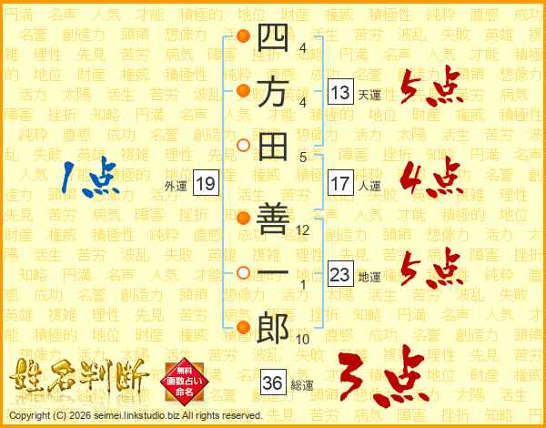 四(4画)方(4画)田(5画) 善(12画)一(1画)郎(10画)