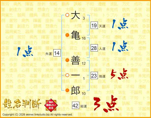 大(3画)亀(16画) 善(12画)一(1画)郎(10画)