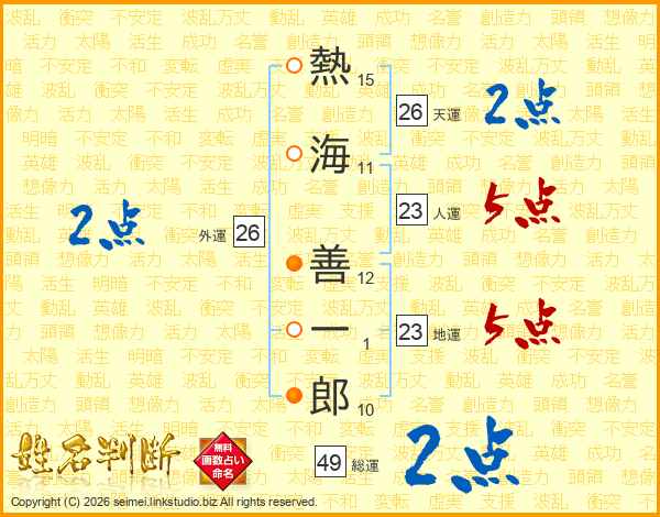熱(15画)海(11画) 善(12画)一(1画)郎(10画)