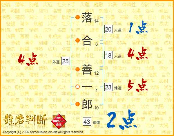 落(14画)合(6画) 善(12画)一(1画)郎(10画)