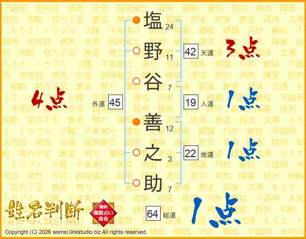 塩(24画)野(11画)谷(7画) 善(12画)之(3画)助(7画)