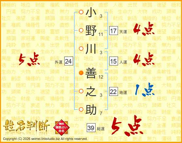 小野川善之助さんの総運は39画の5点!