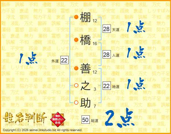 棚(12画)橋(16画) 善(12画)之(3画)助(7画)