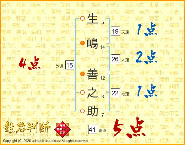 生(5画)嶋(14画) 善(12画)之(3画)助(7画)