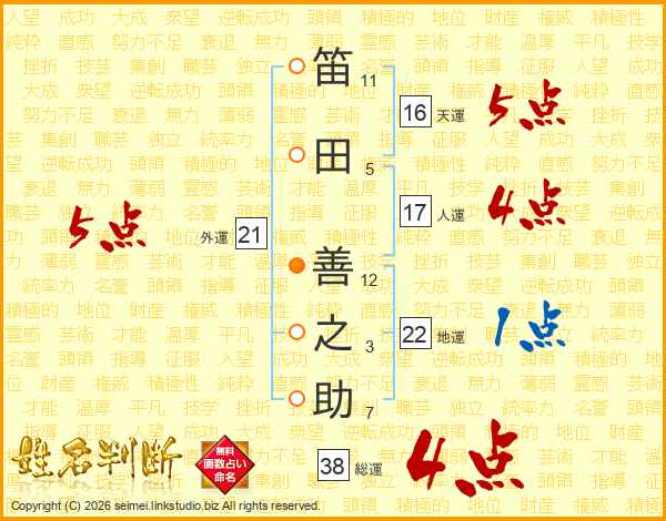 笛田善之助さんの総運は38画の4点!
