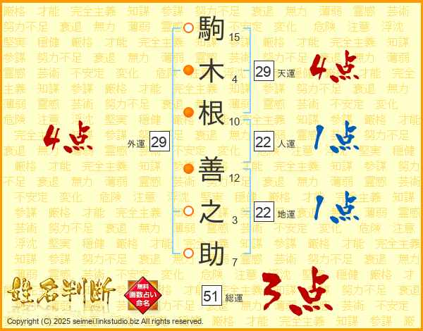 駒(15画)木(4画)根(10画) 善(12画)之(3画)助(7画)