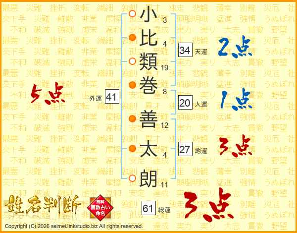 小(3画)比(4画)類(19画)巻(8画) 善(12画)太(4画)朗(11画)