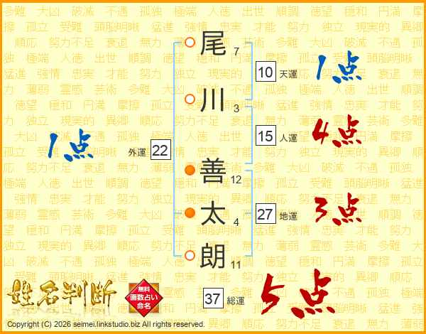 尾川善太朗さんの総運は37画の5点!
