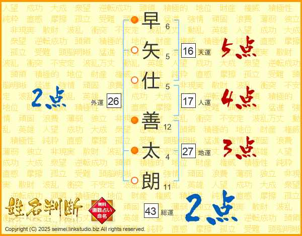 早(6画)矢(5画)仕(5画) 善(12画)太(4画)朗(11画)