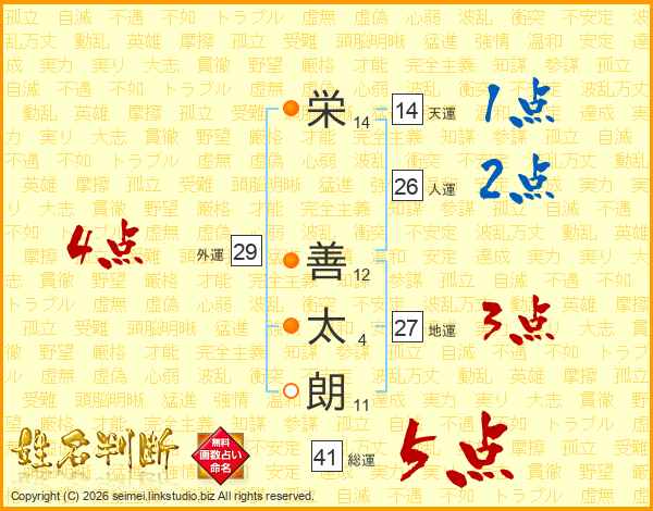 栄(14画) 善(12画)太(4画)朗(11画)