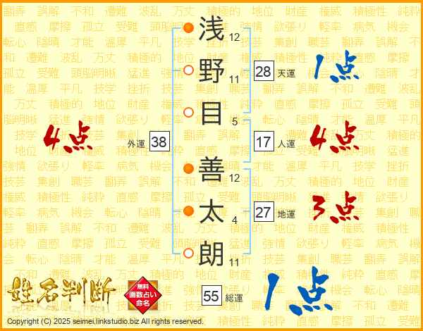 浅(12画)野(11画)目(5画) 善(12画)太(4画)朗(11画)
