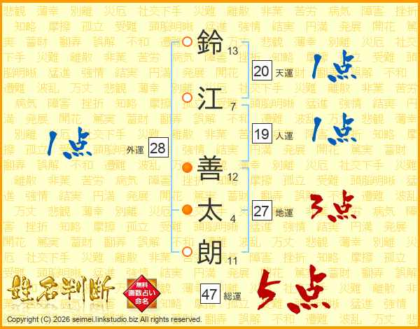 鈴(13画)江(7画) 善(12画)太(4画)朗(11画)