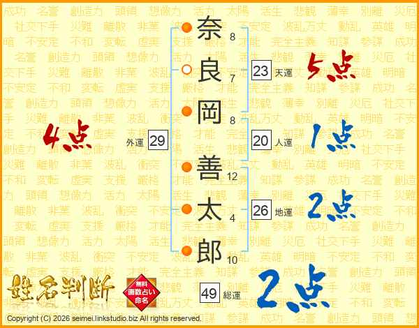 奈(8画)良(7画)岡(8画) 善(12画)太(4画)郎(10画)