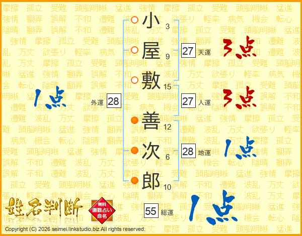 小(3画)屋(9画)敷(15画) 善(12画)次(6画)郎(10画)