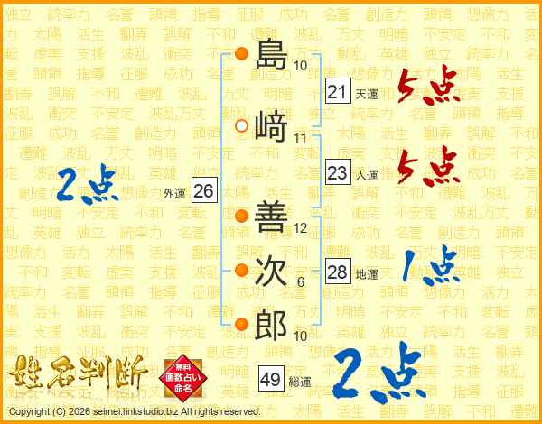 島(10画)﨑(11画) 善(12画)次(6画)郎(10画)
