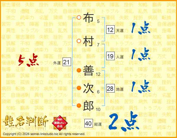 布(5画)村(7画) 善(12画)次(6画)郎(10画)
