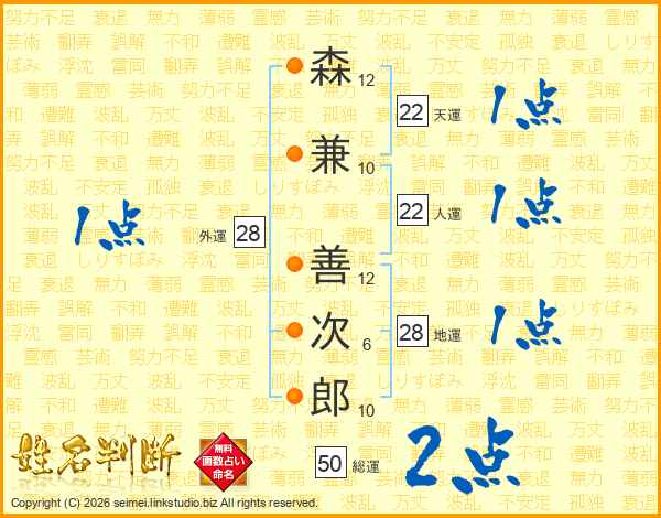 森(12画)兼(10画) 善(12画)次(6画)郎(10画)