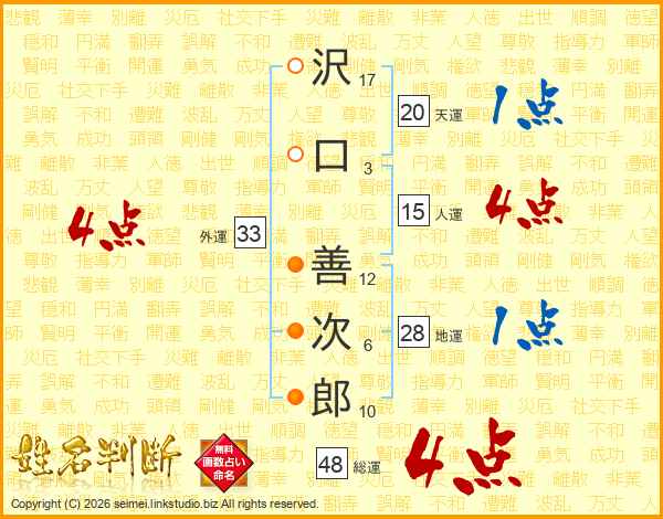 沢(17画)口(3画) 善(12画)次(6画)郎(10画)