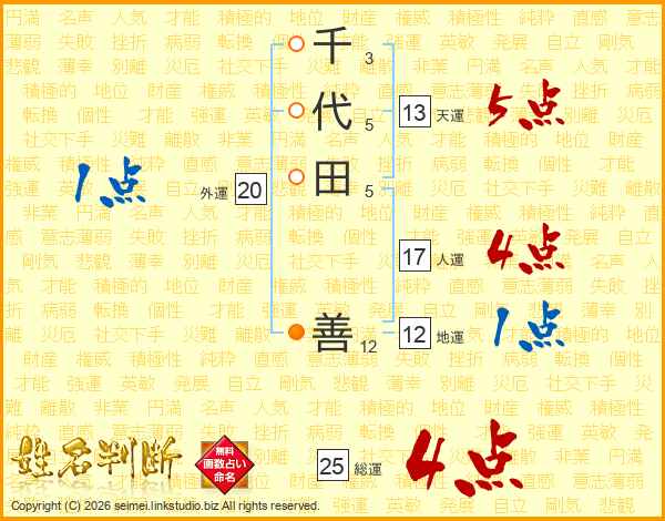 生活面を象徴する運勢です。外部から受ける影響力を表し、結婚運、家庭運や職場、環境への順応性を表します。総運から人運を引いた画数。姓や名が1文字の場合を除く。