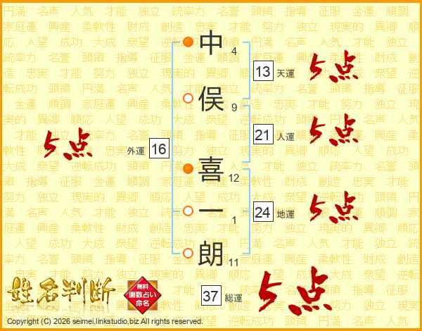 中(4画)俣(9画) 喜(12画)一(1画)朗(11画)
