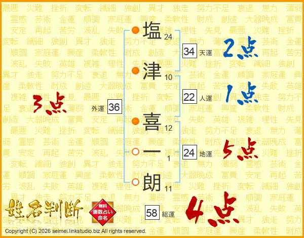 塩(24画)津(10画) 喜(12画)一(1画)朗(11画)