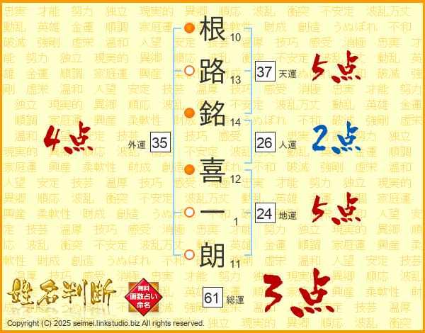 根(10画)路(13画)銘(14画) 喜(12画)一(1画)朗(11画)