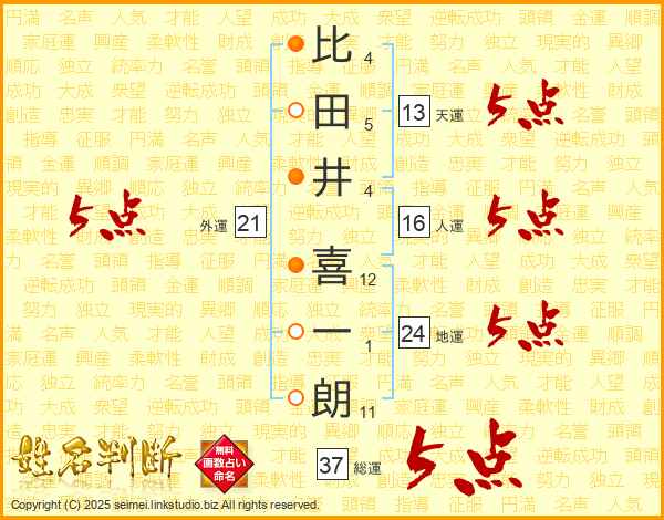 比(4画)田(5画)井(4画) 喜(12画)一(1画)朗(11画)
