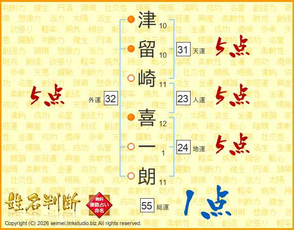 津(10画)留(10画)崎(11画) 喜(12画)一(1画)朗(11画)