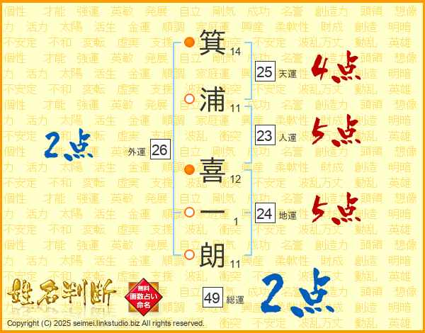 箕(14画)浦(11画) 喜(12画)一(1画)朗(11画)