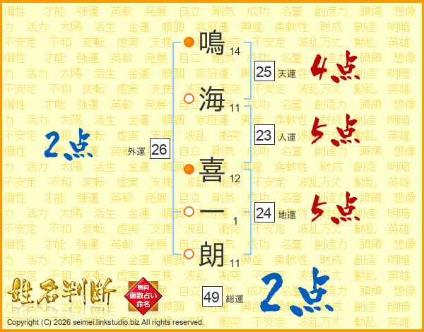 鳴(14画)海(11画) 喜(12画)一(1画)朗(11画)