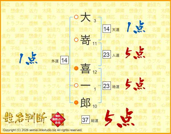 大(3画)嵜(11画) 喜(12画)一(1画)郎(10画)