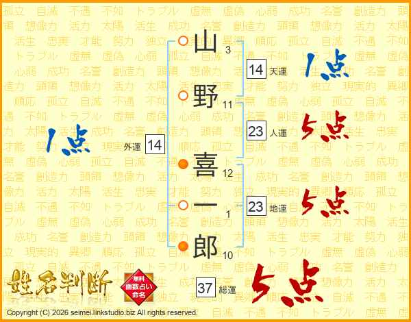 山(3画)野(11画) 喜(12画)一(1画)郎(10画)