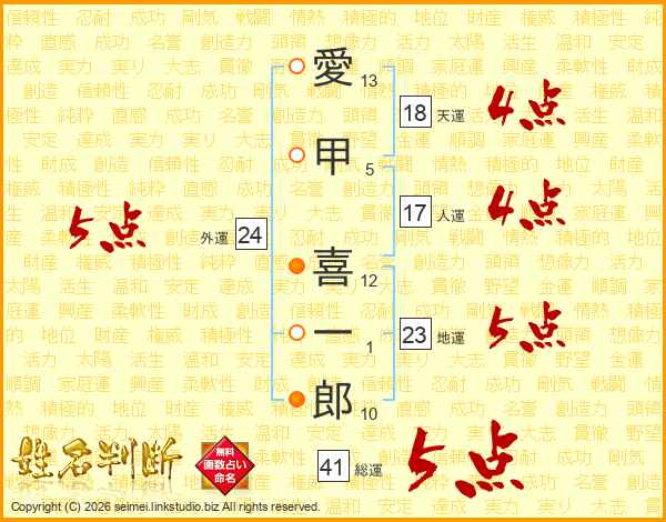 愛(13画)甲(5画) 喜(12画)一(1画)郎(10画)
