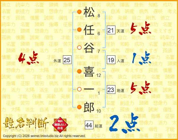 松(8画)任(6画)谷(7画) 喜(12画)一(1画)郎(10画)
