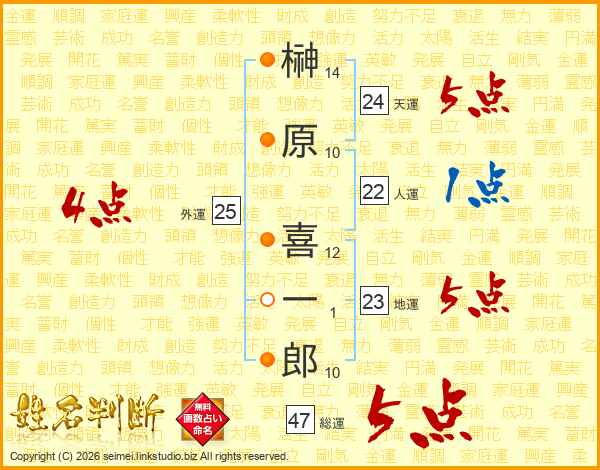 榊(14画)原(10画) 喜(12画)一(1画)郎(10画)