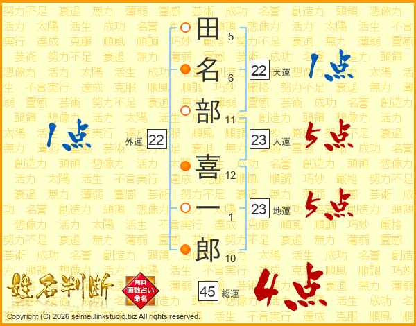 田(5画)名(6画)部(11画) 喜(12画)一(1画)郎(10画)