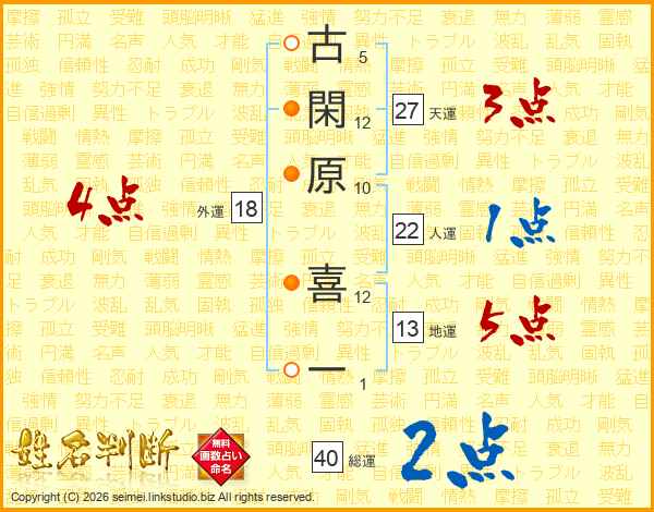 古(5画)閑(12画)原(10画) 喜(12画)一(1画)