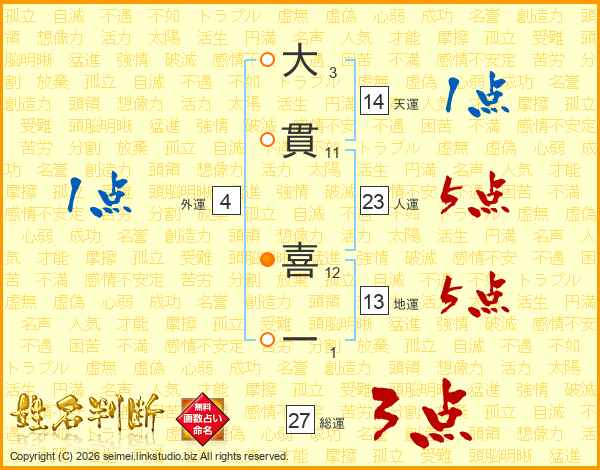 あなたの人生を表す1番重要な運勢です。生涯を通じて影響する総合運となり、主に50歳以降の晩年期に影響を及ぼします。苗字と名前の合計画数。