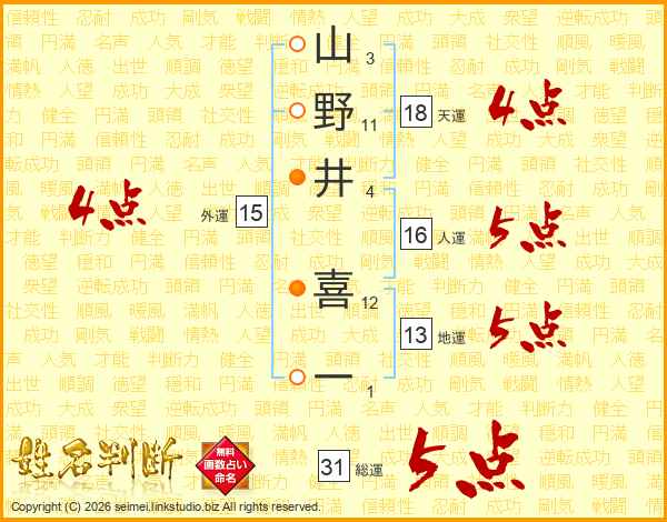 山野井喜一さんの総運は31画の5点!