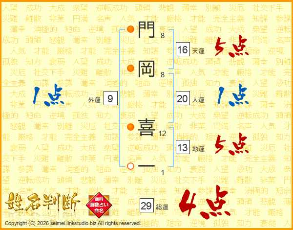 門(8画)岡(8画) 喜(12画)一(1画)