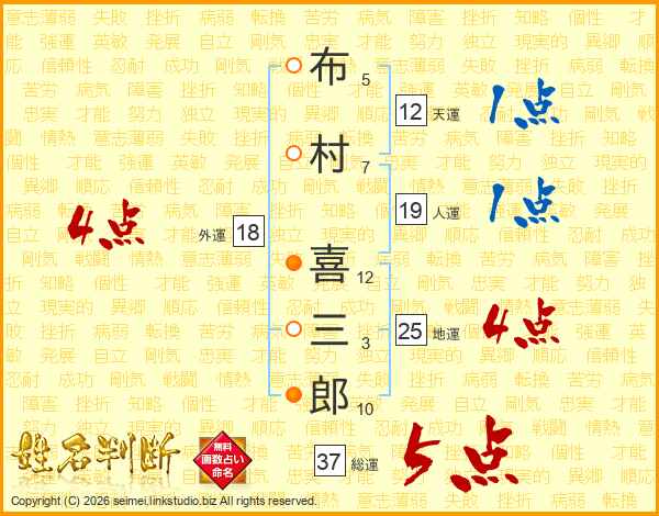 布(5画)村(7画) 喜(12画)三(3画)郎(10画)