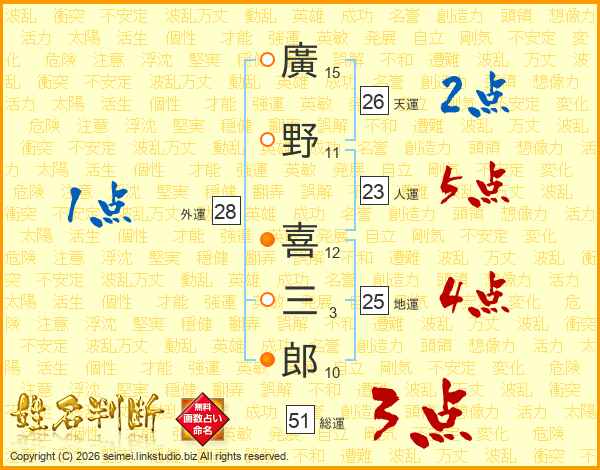 廣(15画)野(11画) 喜(12画)三(3画)郎(10画)