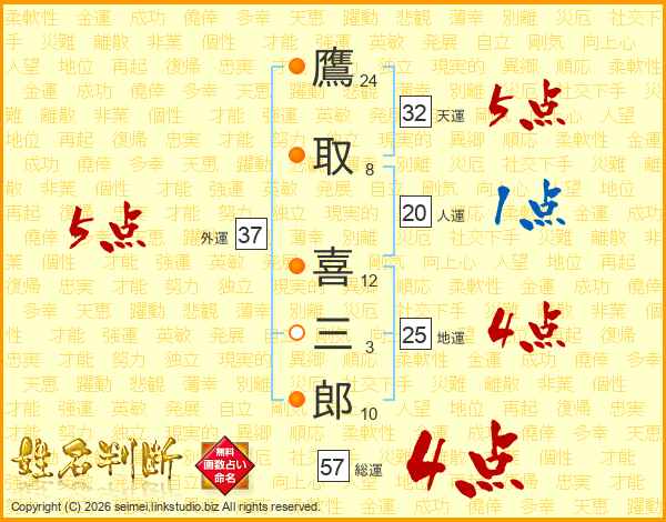 鷹(24画)取(8画) 喜(12画)三(3画)郎(10画)