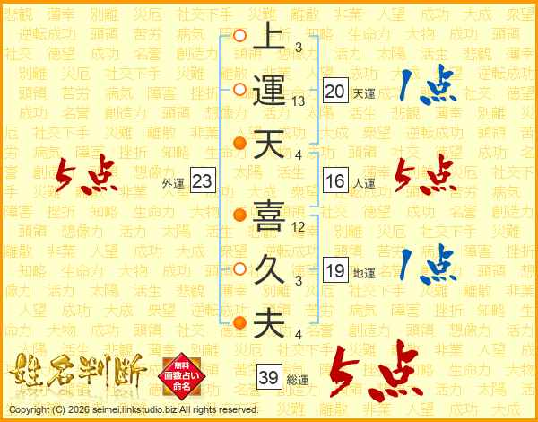 上(3画)運(13画)天(4画) 喜(12画)久(3画)夫(4画)