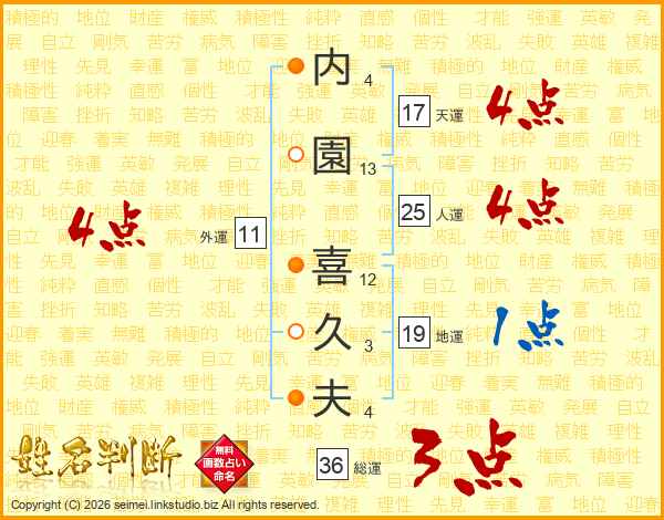 内(4画)園(13画) 喜(12画)久(3画)夫(4画)