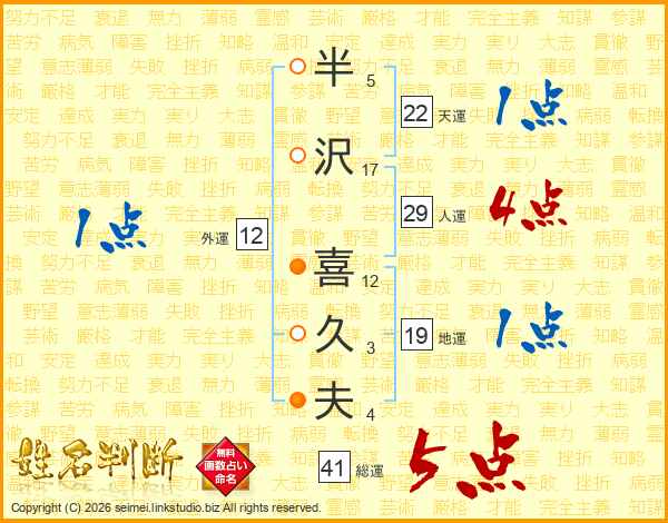 半沢喜久夫さんの総運は41画の5点!