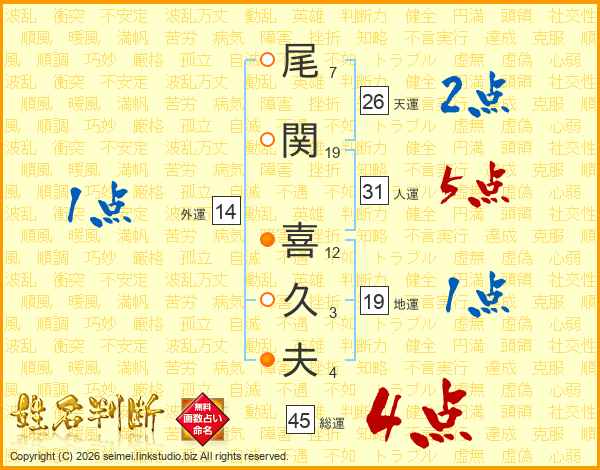 尾(7画)関(19画) 喜(12画)久(3画)夫(4画)