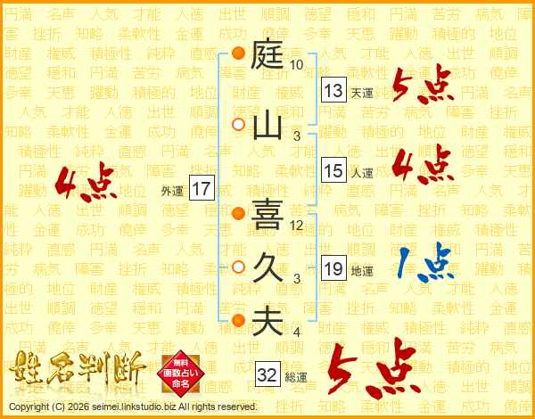 庭(10画)山(3画) 喜(12画)久(3画)夫(4画)