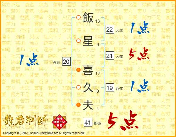 飯(13画)星(9画) 喜(12画)久(3画)夫(4画)